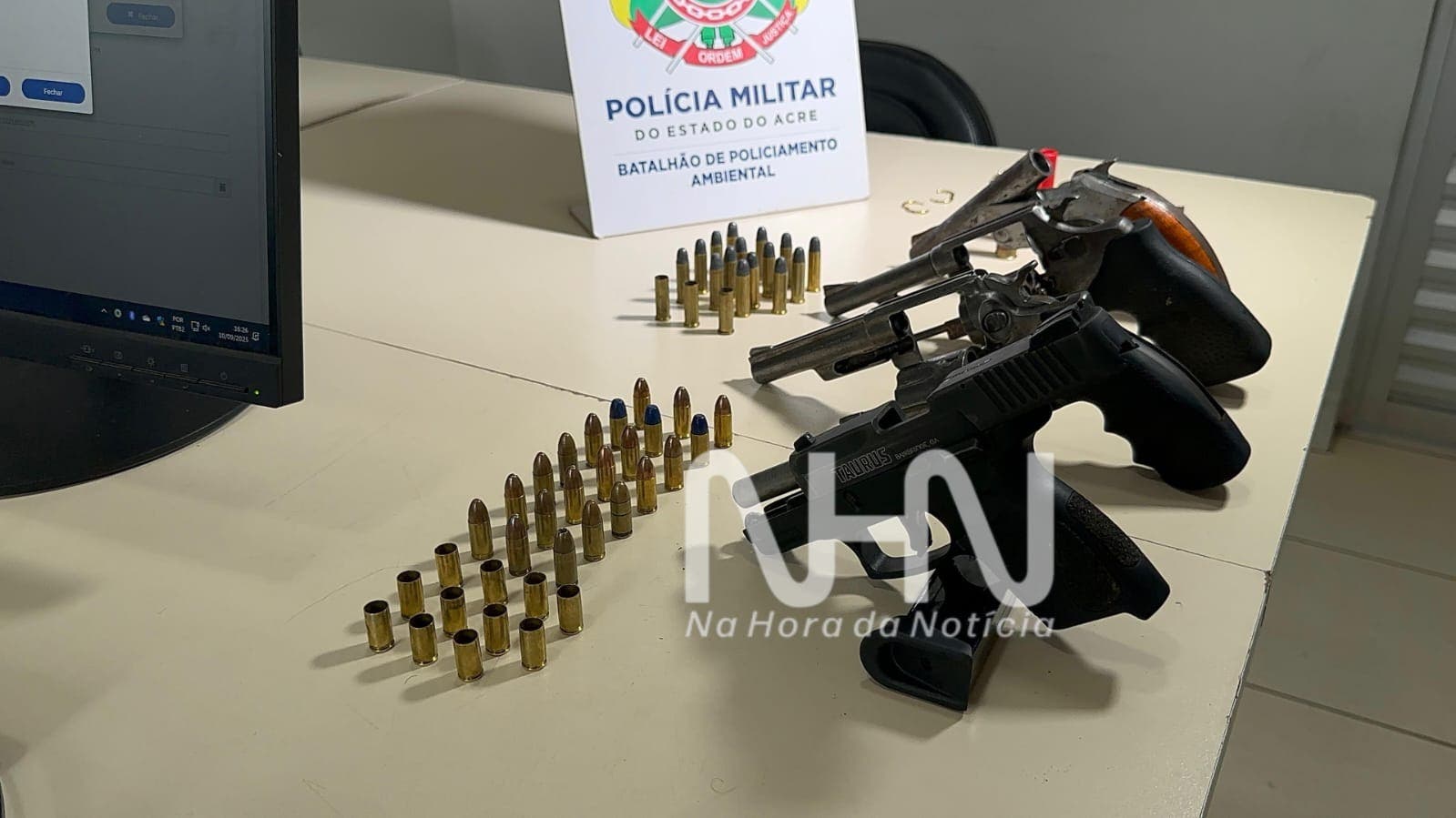 Com eles, foram encontradas uma pistola calibre 9 mm, dois revólveres calibre 38, uma garrucha, além de 39 munições intactas e 13 deflagradas.