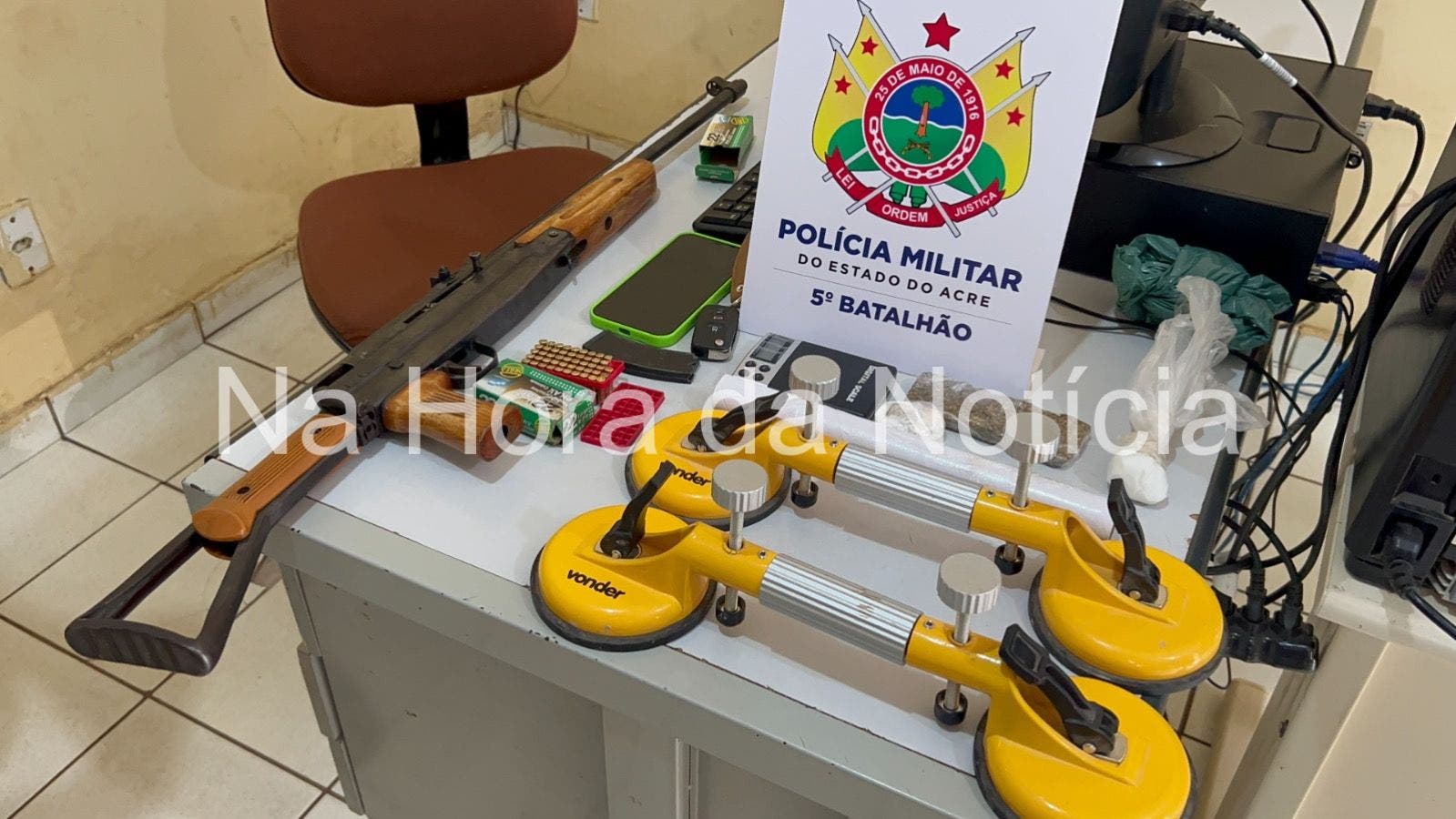 Durante a investigação que foi feita com auxílio de um drone, foi descoberto que uma casa em um bairro de Brasiléia estava sendo usada como uma “casa-cofre” de uma facção criminosa. No local foi guardada uma grande quantidade de entorpecentes e um fuzil calibre 22, com várias munições intactas.