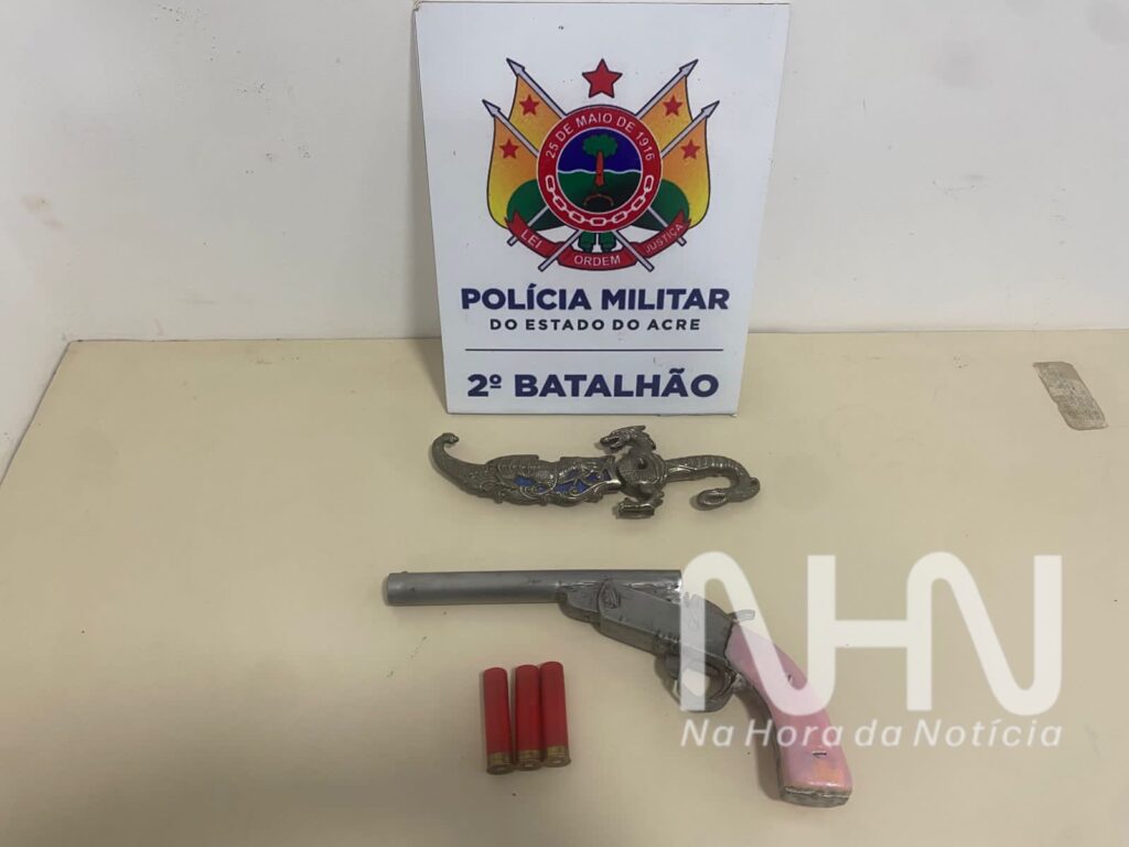 Uma ação da Força Tática do 2º Batalhão da Polícia Militar do Acre (2º BPM) resultou na apreensão de uma arma de fogo calibre 28, munições e uma arma branca na tarde desta quinta-feira (31), em uma residência localizada no bairro Calafate, em Rio Branco.