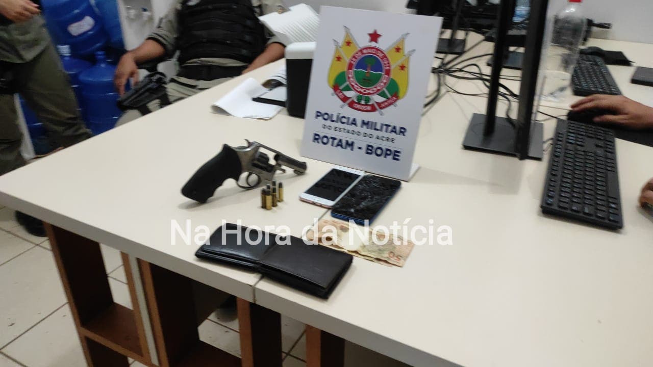 Jailton Martins Pereira, 27 anos, José Leonardo da Silva Saldanha, 19, Gilmar de Silva, 39, José Gustavo Lima Ferreira, 18, Vitor Daniel Oliveira Rocha, 18, foram presos e um menor de 16 anos foi apreendido, ambos suspeitos de organização criminosa por porte ilegal de arma de fogo, na tarde desta terça-feira (28), na rua Juricaba, no bairro João Paulo II, na região da Baixada da Sobral, em Rio Branco.