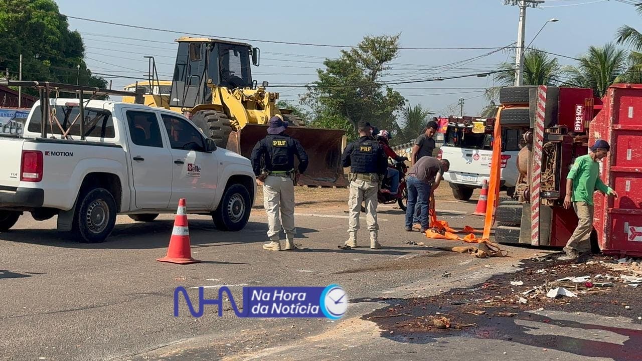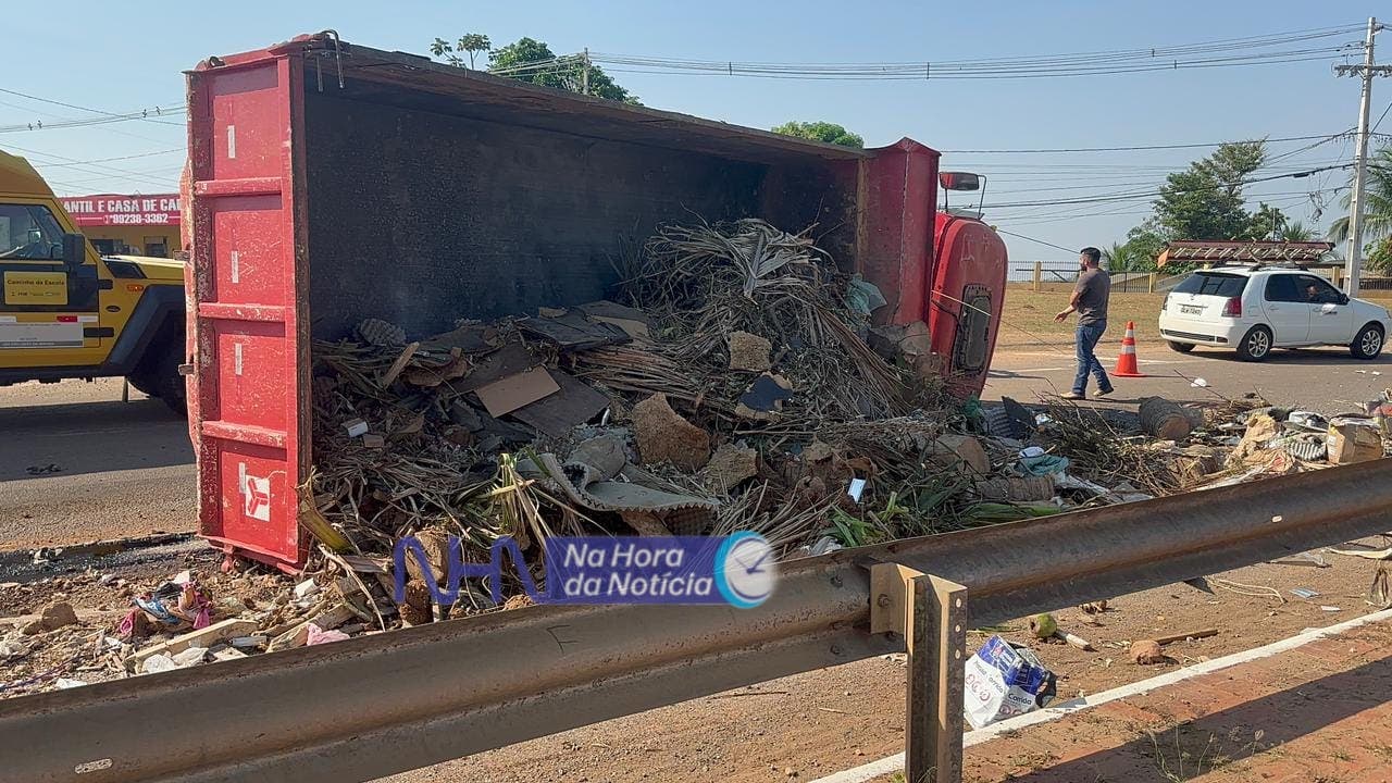 Uma caçamba tombou ao desviar de um caminhão na manhã desta segunda-feira (7), na BR-364, na rotatória próxima ao shopping na Via Verde, no bairro Floresta Sul, em Rio Branco.