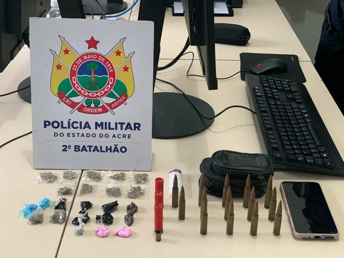 Durante a operação, os militares perceberam a presença de dois indivíduos, que estavam observando a atuação policial e correspondiam às características descritas pelas vítimas. Ao tentarem se aproximar, os suspeitos fugiram, mas um deles, que estava sendo monitorado por tornozeleira eletrônica, foi capturado. As vítimas o reconheceram e, após uma busca pessoal, foram encontradas substâncias entorpecentes e munições de diferentes calibres em sua posse.