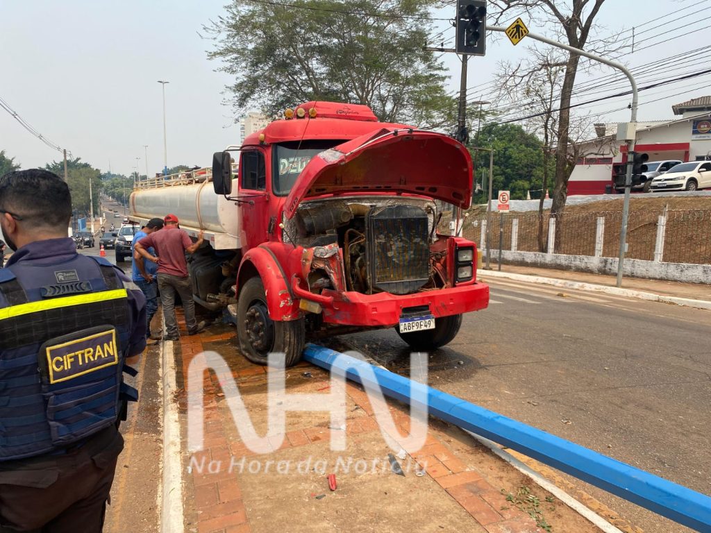 Um caminhão-pipa perdeu o controle, subiu em um canteiro e derrubou um poste na manhã desta segunda-feira (26), na Avenida Antônio da Rocha Viana, no bairro Santa Quitéria, em Rio Branco.