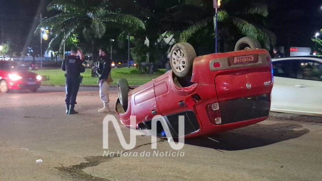 Um acidente de trânsito envolvendo dois veículos resultou no capotamento de um Fiat Uno vermelho na noite desta segunda-feira (9), na rotatória da Corrente, trecho da BR-364, em Rio Branco.