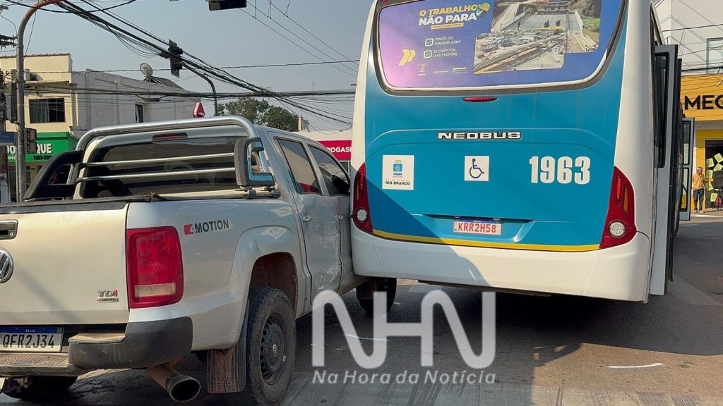 Uma colisão entre uma caminhonete e um ônibus deixou o trânsito lento no cruzamento da Avenida Getúlio Vargas com a Avenida Nações Unidas, nas proximidades do pronto-socorro de Rio Branco, na tarde desta quinta-feira (25).