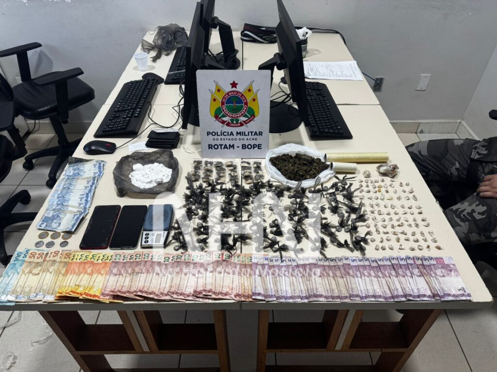 Com os acusados, foram apreendidas 24 trouxinhas de maconha e mais 190 gramas da droga, 88 pedras de crack e 5 pedras maiores (totalizando 80 g), 102 trouxinhas de cocaína e um saco maior da substância (totalizando 160 g), além de uma balança de precisão, material para embalo e R$ 1.100,00 em dinheiro, proveniente da venda dos entorpecentes.