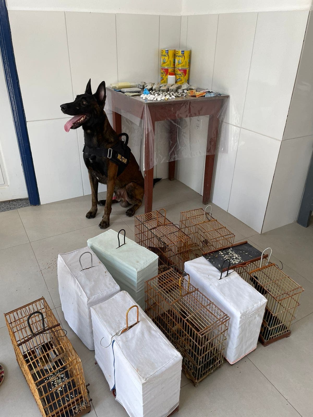 Os militares do 7° BPM localizaram 32 trouxinhas de maconha em um quarto e, com auxílio do Cão Policial Luck, foram localizadas 13 barras de maconha em outro quarto, e mais 31 trouxinhas de cocaína e uma balança de precisão.