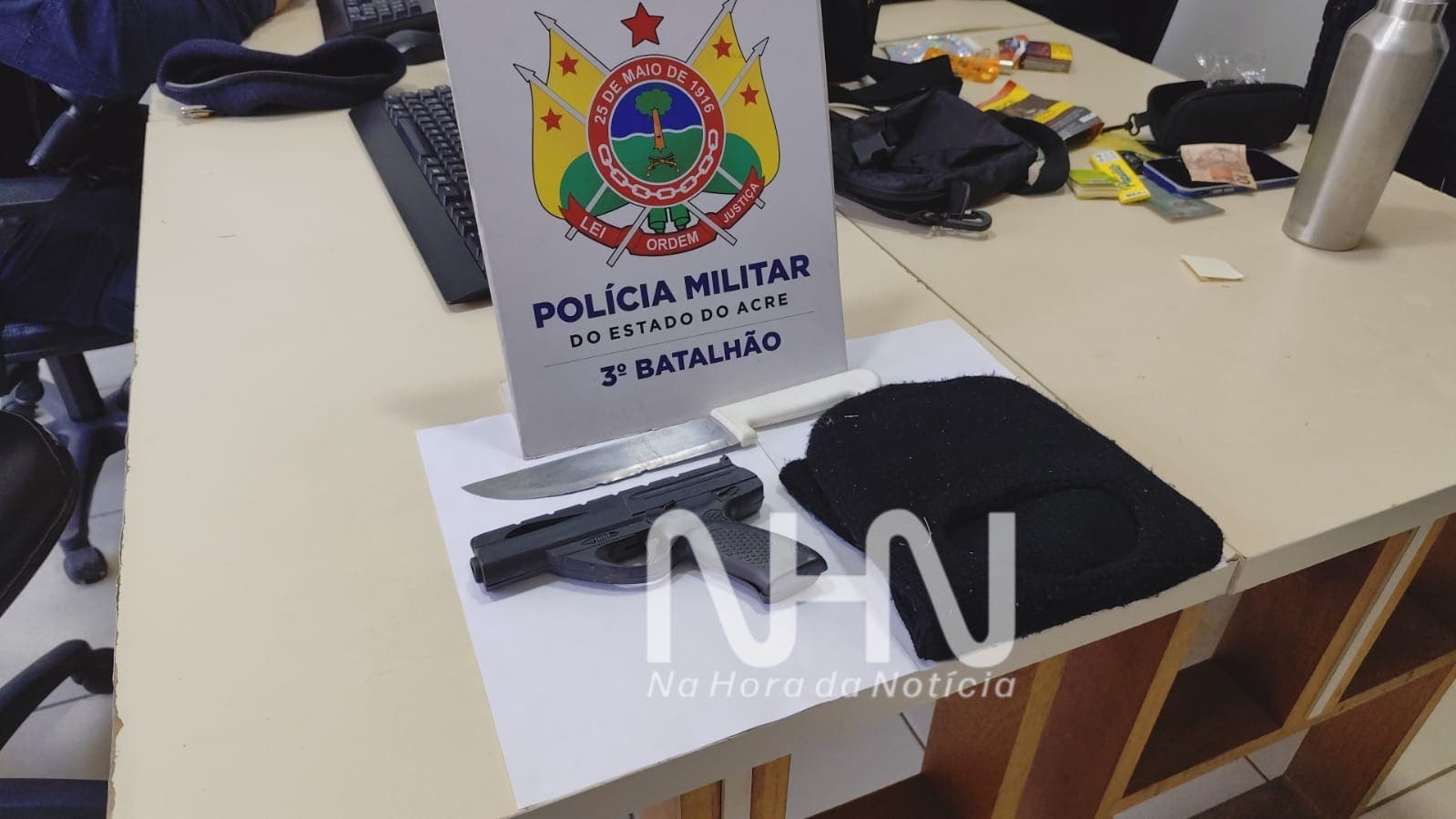Um homem monitorado por tornozeleira eletrônica e um adolescente foram detidos no fim da tarde desta sexta-feira (18), após assaltarem uma mulher na Rua 7 de Setembro, no bairro Placas, em Rio Branco.