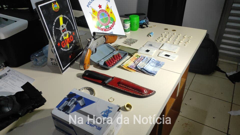 De posse da denúncia, os militares do Giro foram até o local indicado e conseguiram ver as pessoas mencionados. A dupla estava na moto e foi abordada, e durante a revista não foi encontrado nada. Os PMs pediram para verificar dentro da casa que os homens estavam e o proprietário autorizou. No local, foi encontrada uma escopeta calibre 36, com 7 munições intactas. Foram encontrados ainda R$ 100 em espécie, 6 barrinhas de maconha, 36 pedras de crack e 3 saquinhos de pasta a base de cocaína.