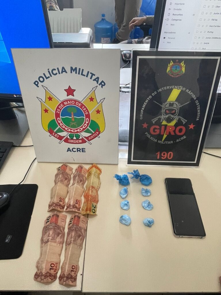 A segunda ocorrência se deu no bairro Baixa da Colina, em Rio Branco, quando guarnição, durante rondas preventivas no local, abordou um homem de 19 anos. Durante a abordagem, foram encontrados com o rapaz, 60 reais em cédulas de 20 e 10 reais, características da venda de drogas, além de oito trouxinhas de cocaína.