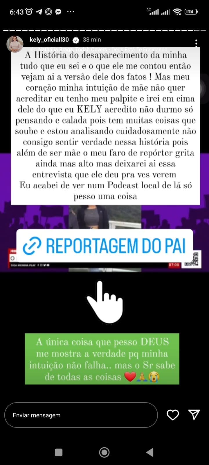 “Tenho meu palpite e irei em cima dele, do que eu Kely, acredito. Não durmo, só pensando calada, pois tem muitas coisas que soube e estou analisando cuidadosamente. Não consigo sentir verdade nessa história, pois além de ser mãe, o meu faro de repórter grita ainda mais alto”, afirma.