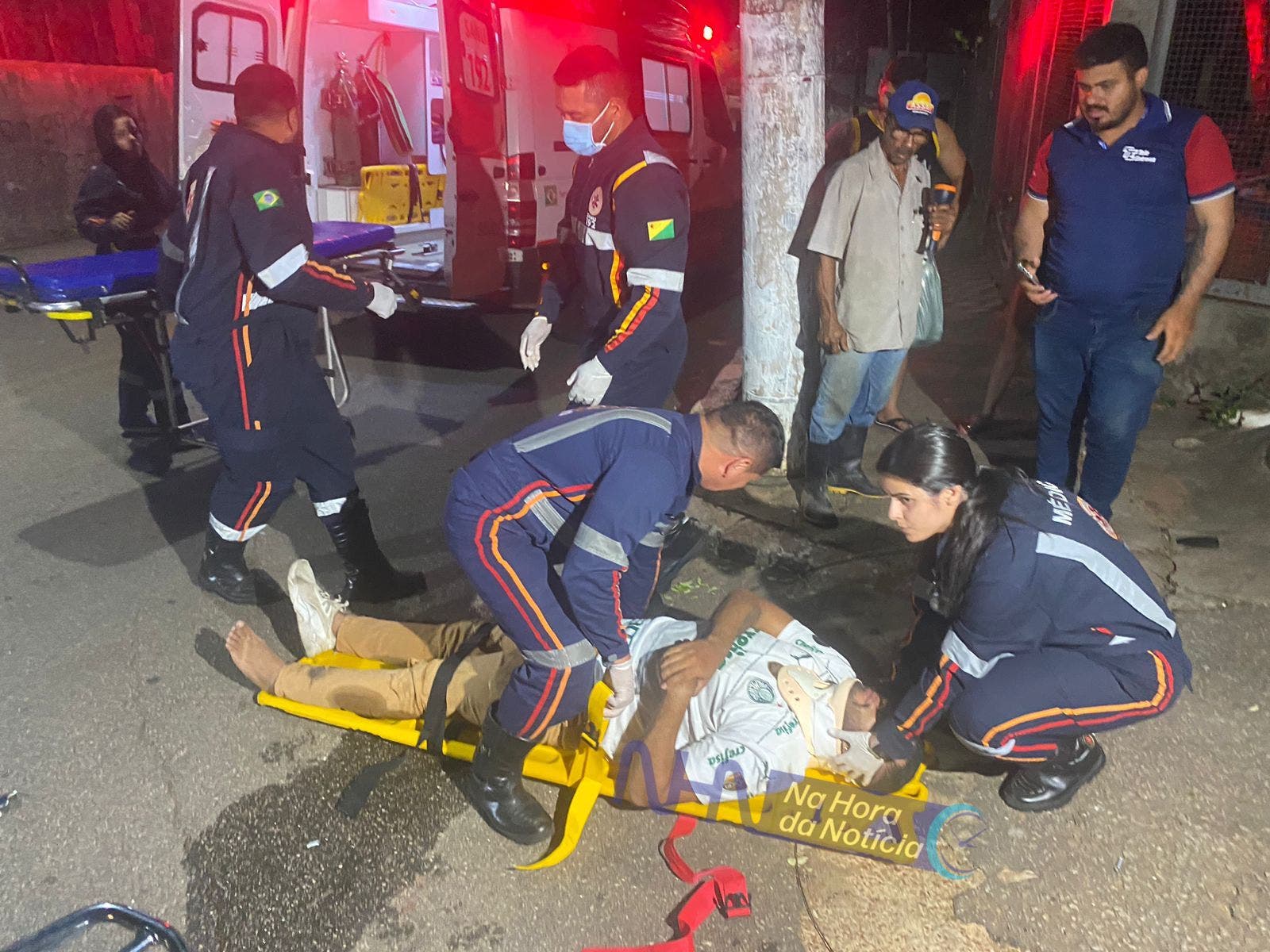 A médica prestou os primeiros atendimentos à vítima e solicitou apoio da ambulância 02, que era a única viatura disponível na base, pois as outras estavam em ocorrências. O motociclista sofreu uma laceração no ombro e reclamava de dores.