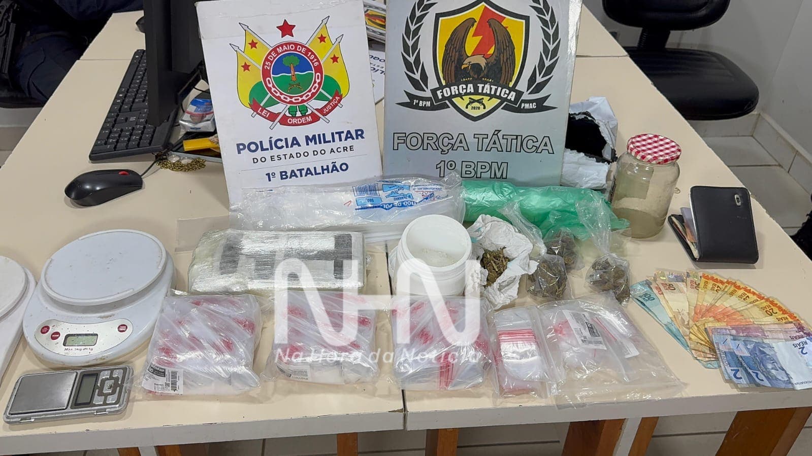 Tiago Braga da Silva, de 25 anos, foi preso em flagrante por tráfico de drogas e associação para o tráfico na tarde desta quinta-feira (4), em um beco nas imediações do Motel Classic, em Rio Branco. A ação foi realizada pela Força Tática do 1º Batalhão da Polícia Militar após denúncias anônimas de moradores.
