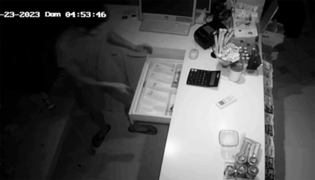 Câmeras de segurança flagraram um homem se aproximando e quebrando uma janela de vidro do estabelecimento. Após adentrar o restaurante, o bandido furta o dinheiro do caixa de atendimento e depois foge rapidamente em direção a uma ponte.
