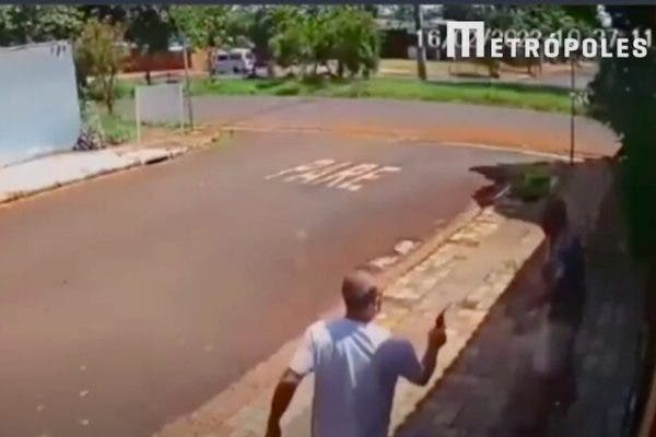 Em seguida, Hugo sai do imóvel com duas espadas e vai em direção ao vizinho. No mesmo instante, Marcelo saca a arma e dispara. O homem de 82 anos morreu na porta de casa.