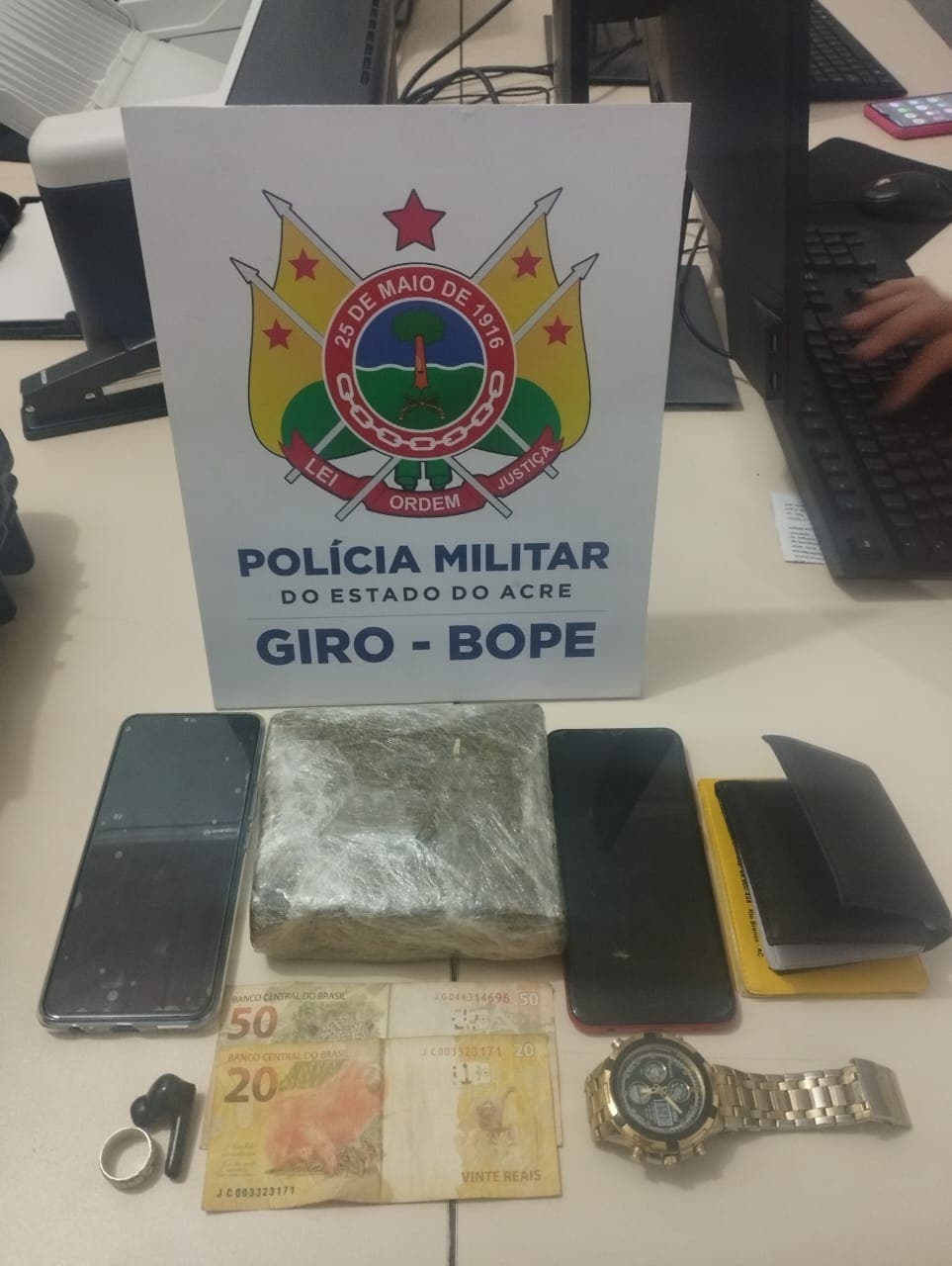 Por medida de segurança, os militares do Giro foram verificar o que estava acontecendo e, ao se aproximarem do carro, viram Arine colocando alguma coisa embaixo das pernas. Nesse momento, foi solicitado que todos os ocupantes saíssem do carro e foi feito uma revista veicular. Embaixo do banco do carro foi encontrado 506 gramas de maconha em forma de “tijolo”.