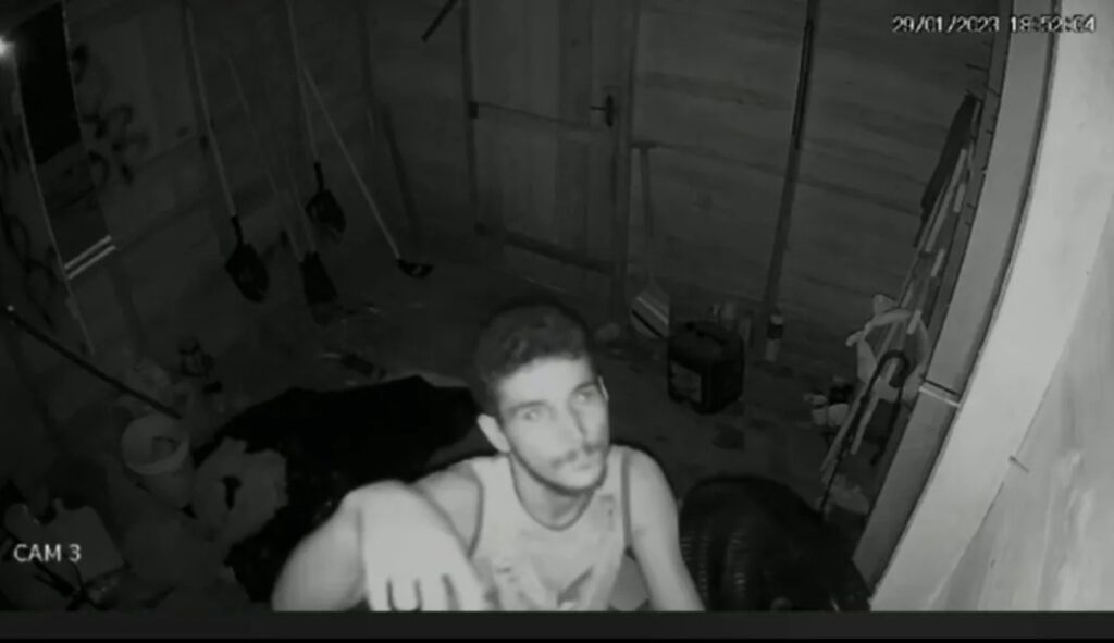 Nas imagens de três câmeras, é possível ver o homem, que é morador local, chegando pelo rio e pegando um pau. Em um dos quartos da casa pega um rastelo, mangueira e outros itens. Em seguida, percebe a câmera e destrói o equipamento.