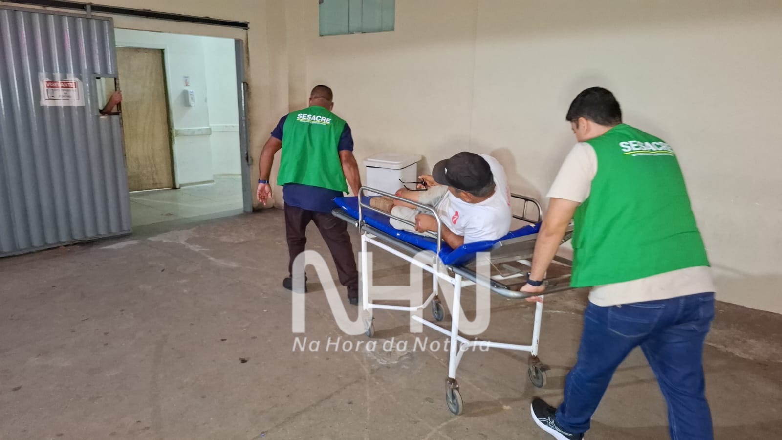 Mesmo ferido, ele conseguiu chegar por meios próprios ao pronto-socorro de Rio Branco, onde recebeu atendimento médico. Os profissionais de saúde suspeitam de fratura na perna direita, e o paciente passará por exames de imagem para confirmação.