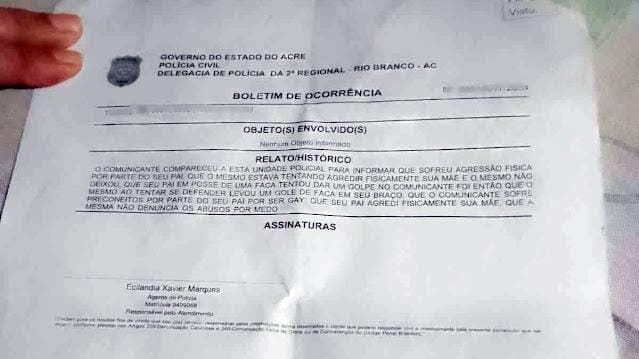Um caso de violência doméstica abalou a comunidade do Ramal do Macarrão, no bairro Belo Jardim 1, em Rio Branco. Um jovem, de apenas 17 anos, tomou a decisão de denunciar seu próprio pai à polícia, após sofrer uma tentativa de homicídio por ser gay. Mesmo com um mandado de prisão expedido, o pai do jovem segue foragido, deixando a família em um estado de constante medo e insegurança.