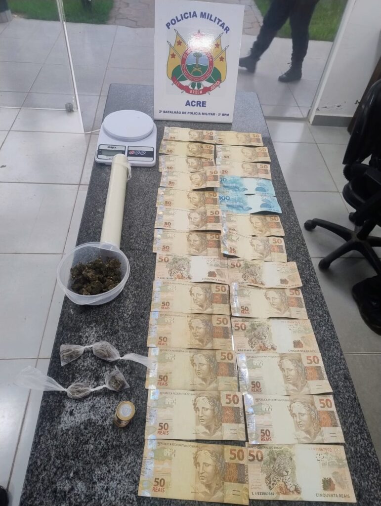 No interior da residência, a polícia apreendeu uma quantidade de drogas já embaladas, além de dinheiro em espécie e uma balança de precisão. Também foram recolhidos insumos destinados ao fracionamento e preparo dos entorpecentes para a venda.