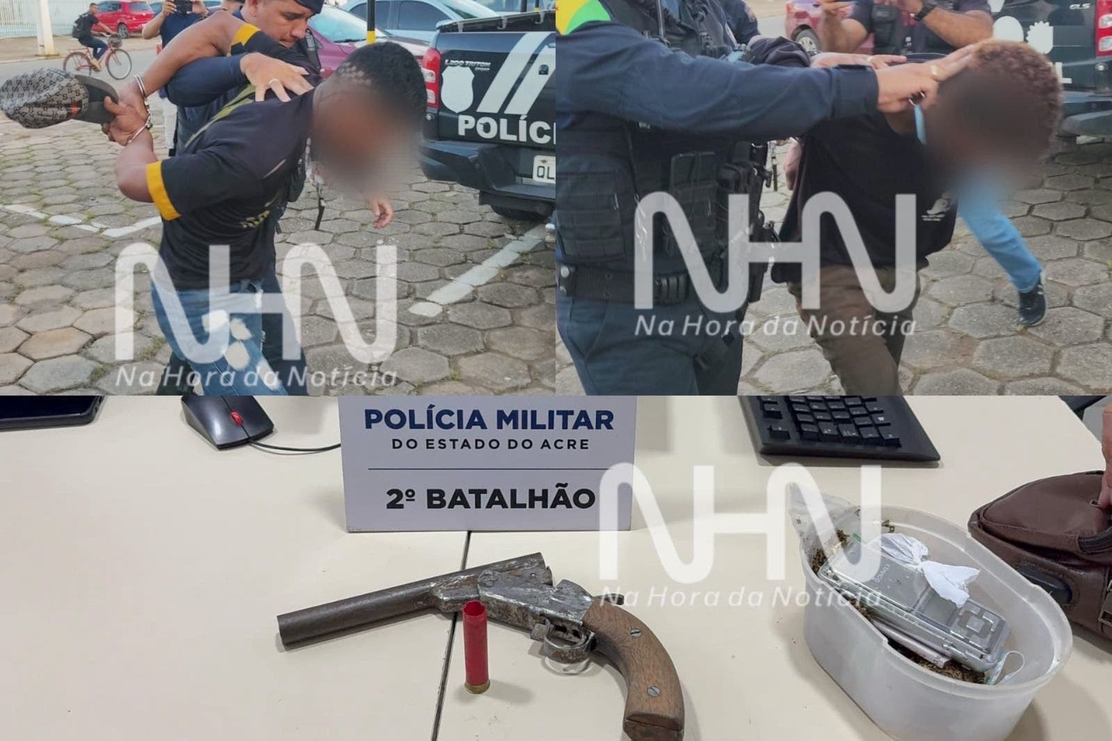 Policiais militares do 2° Batalhão foram acionados e iniciaram buscas na região do bairro Santo Afonso. Os criminosos foram localizados correndo pela BR-364, próximo a um frigorífico. Com eles, os policiais encontraram a escopeta usada na tentativa de homicídio contra o motoboy.