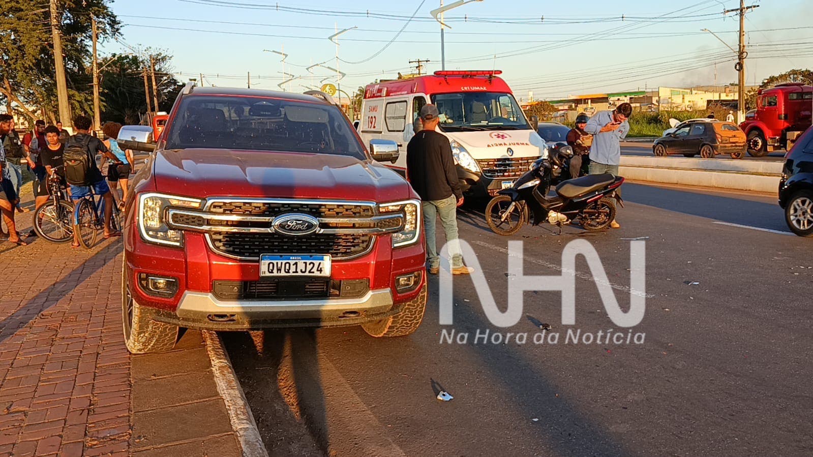 Motociclista tem visão ofuscada pelo sol e colide com caminhonete estacionada irregularmente na Via Chico Mendes; celular é furtado após o acidente