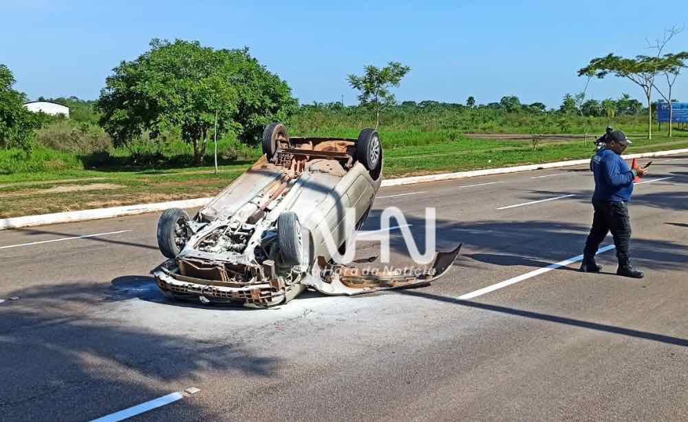 Um carro modelo Renault Clio, de cor bege e placa OVG-9B17, capotou na manhã desta sexta-feira (10), na Avenida Amadeo Barbosa, em Rio Branco.