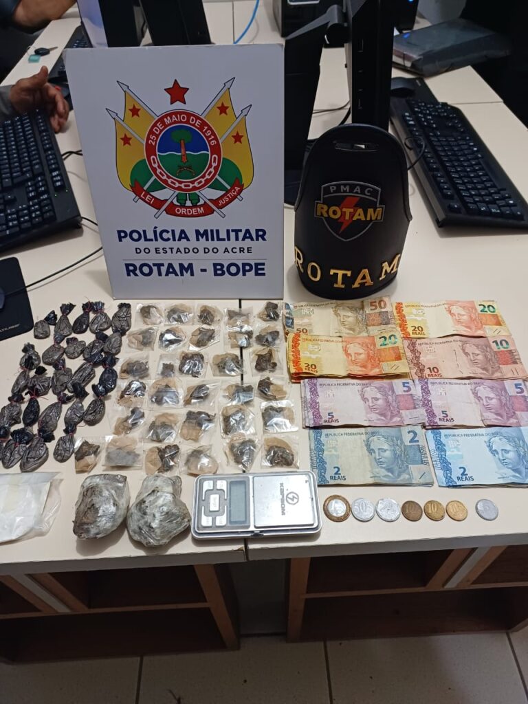 Durante o patrulhamento, os militares avistaram um aglomerado de pessoas em um beco, onde foi possível proceder a abordagem a um homem, sendo com ele encontradas 90 gramas de maconha, 24 papelotes de cocaína, 31 papelotes de Skank e 442 reais.