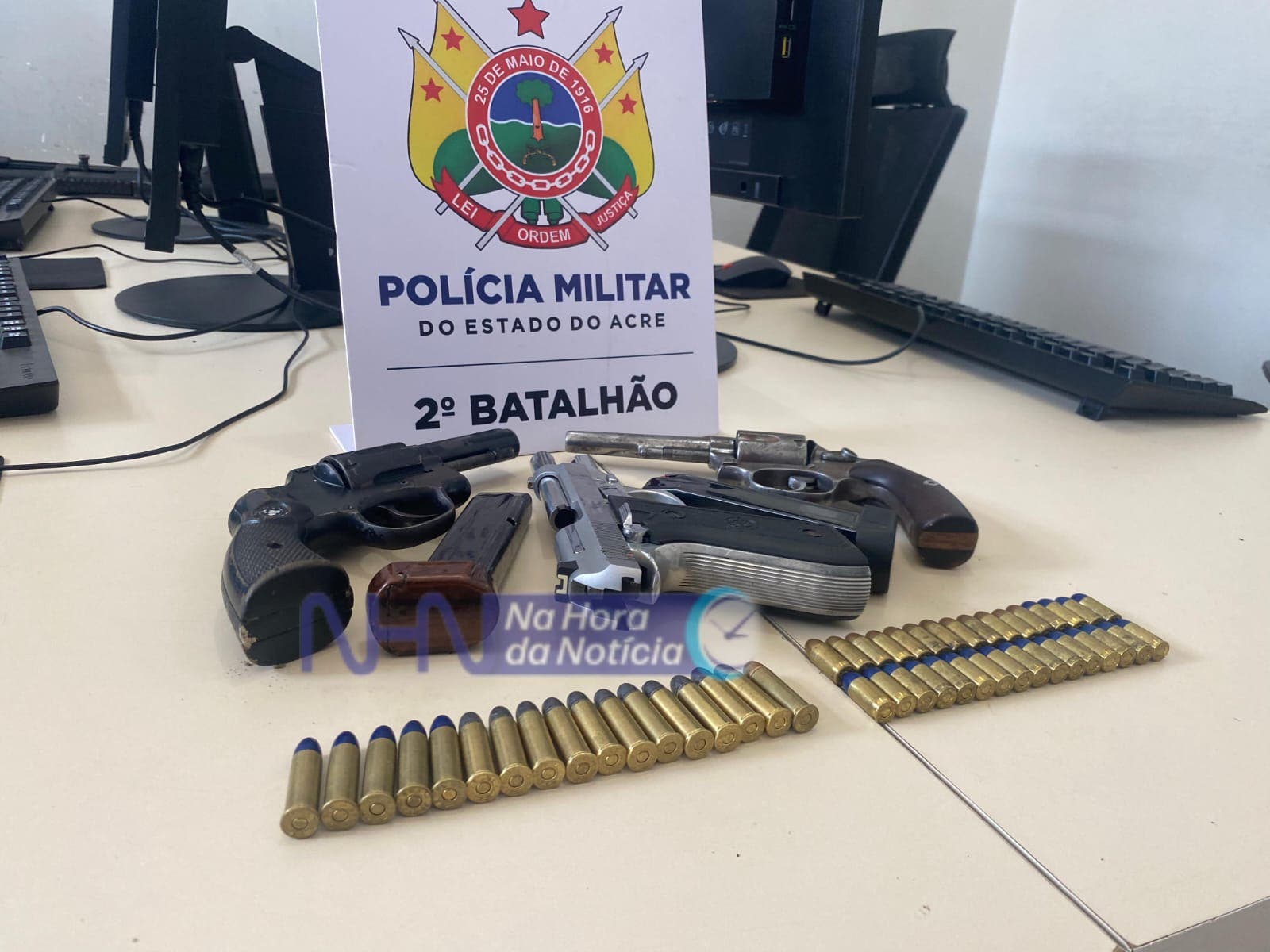 Com a denúncia, os policiais foram até ao local, fizeram um cerco, adentraram na residência e encontraram os criminosos dormindo. Foi realizada uma busca em toda casa e, em posse dos suspeitos, foram encontrados dois revólveres calibre 38 com 17 munições, e uma pistola 380 com 32 munições, totalizando 49 munições.