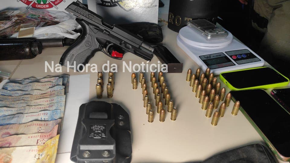 A viatura da Força Tática do 1° Batalhão estava mais próxima do local e foi atender a ocorrência. Ao chegar no local denunciado, a guarnição chamou várias vezes na frente da casa e, ao olhar por cima do portão, percebeu um homem estava pulando o muro da parte de trás da residência. Os PMs ainda perceberam que ao subir o muro, o homem deixou cair uma pistola.