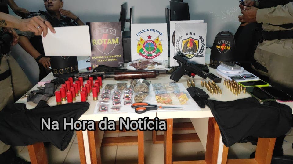 A jovem Patrícia, 21 anos, foi presa e uma adolescente de 17 anos apreendida ambas acusadas de porte ilegal de arma de fogo, tráfico de drogas e receptação de mercadorias roubadas, na noite deste sábado (2), na rua Tucumã, no bairro Mocinha Magalhães, em Rio Branco.