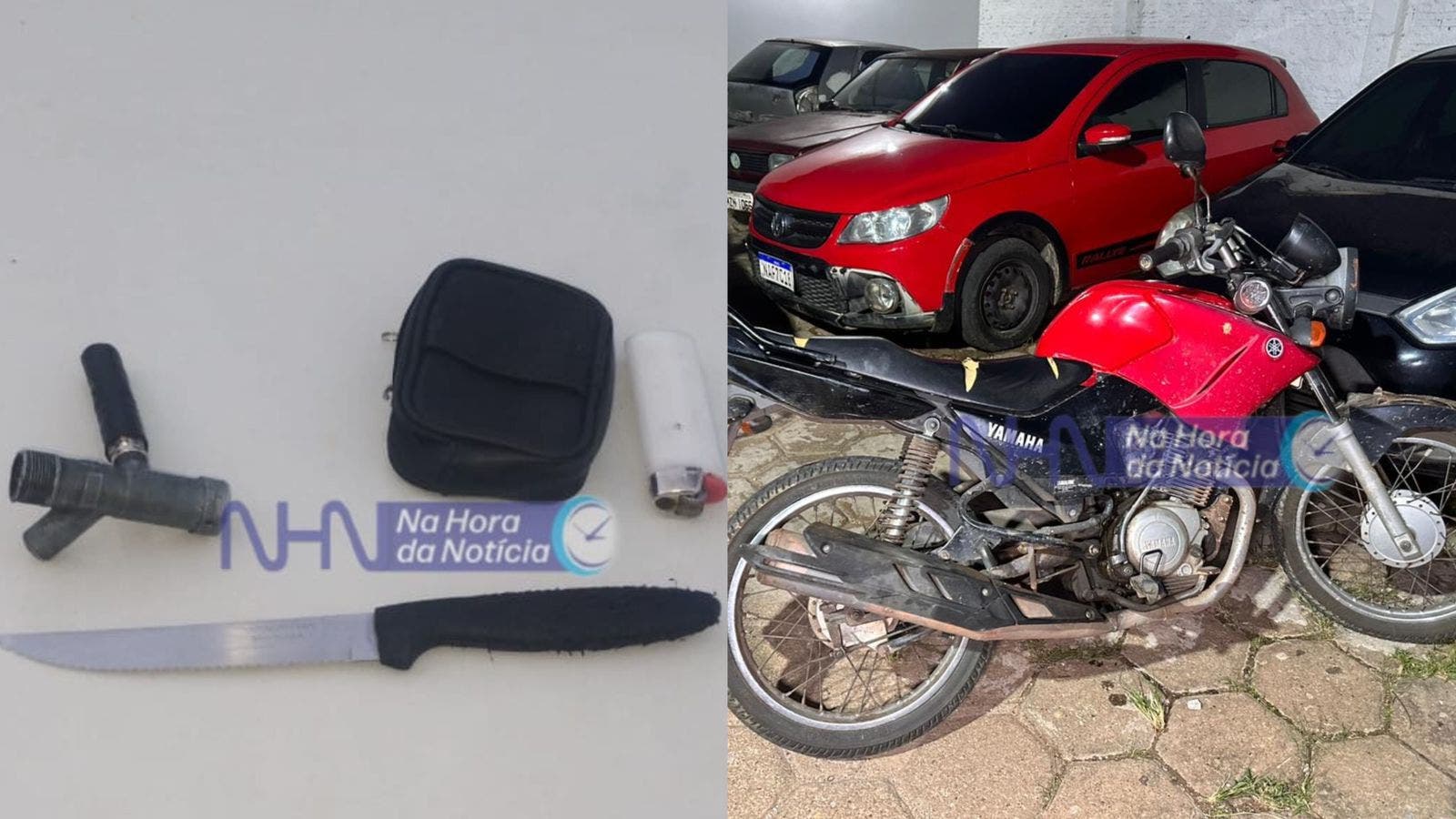 A Policia Militar foi acionada e em uma consulta no sistema, foi constatado que a moto era fruto de furto/roubo e que Thiago possuía passagem por furto e organização criminosa. Uma faca foi encontrada na cintura de Thiago, além do celular da vítima.