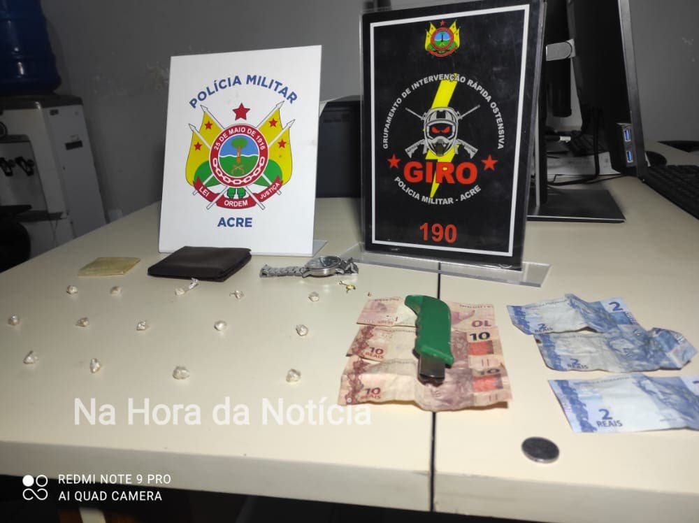 Na revista pessoal nada foi encontrado, mas dentro da sacola que foi jogada tinha cerca de 16 pedra de crack e R$ 36 em espécie, provavelmente oriundo do tráfico de drogas. Júlio disse ainda que não tinha passagem pela polícia e havia chegado recentemente do município de Porto Acre, no interior do Acre.