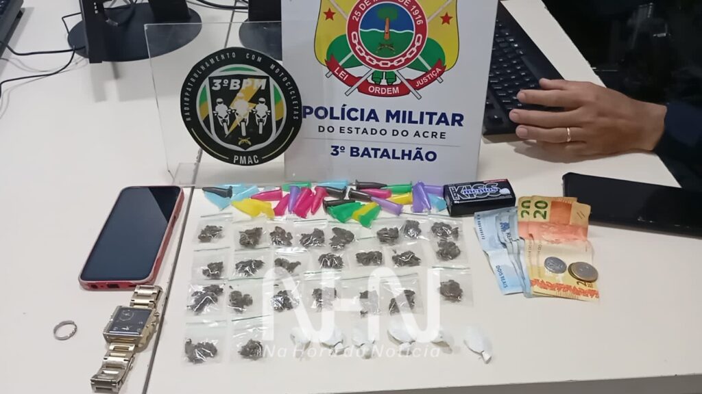 Durante a abordagem, os policiais encontraram seis trouxinhas de cocaína, 28 papelotes de skunk e uma quantia em dinheiro no valor de R$ 53,00 com a adolescente, que afirmou ser namorada de José Ricardo, o qual assumiu ser o proprietário da droga.