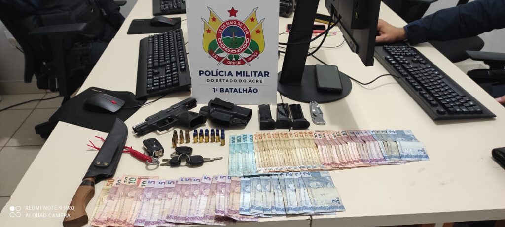 O veículo foi visualizado e abordado e, após consulta, confirmada ser produto de roubo. Uma caminhonete que estava dando suporte a ação criminosa também foi apreendida. Em seu interior foi localizada uma pistola 9 milímetros, com 20 munições. Uma mulher e um homem foram presos.