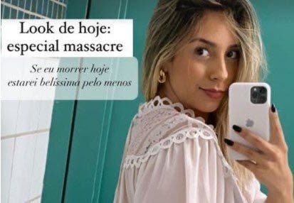 Em Story compartilhado na rede social, a professora aparece em uma foto, com a legenda “Look de hoje: especial massacre. Se eu morrer hoje, estarei belíssima, pelo menos”.