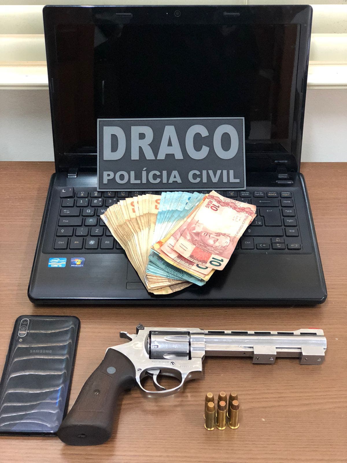 Na diligência foram apreendidos uma arma de fogo, munições, telefone celular, notebook e a quantia de R$ 3.570,00 (Três Mil Quinhentos e Setenta Reais). J.F.B.M possui anotação criminal anterior pela prática de uso de documento falso.