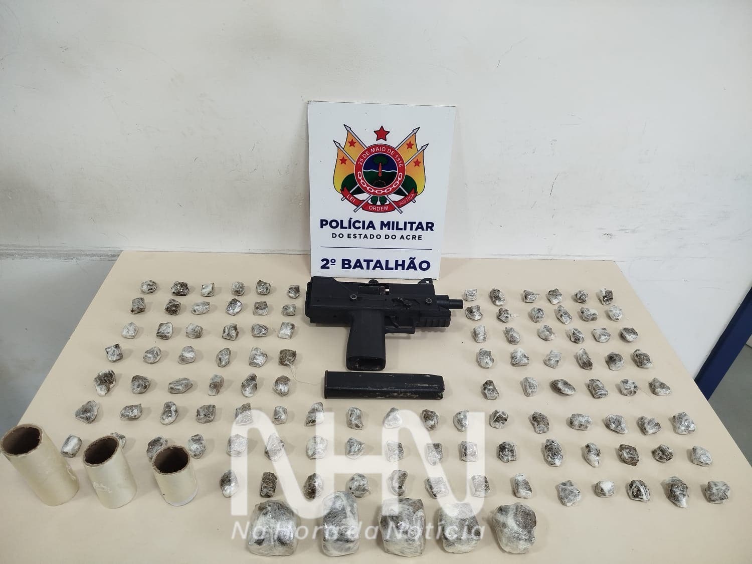 Na tarde desta sexta-feira, 5, uma ação do 2° Batalhão da Polícia Militar resultou na apreensão de uma submetralhadora UZI calibre 9 mm, aparentemente produzida por impressão 3D, além de 112 porções de skank. O material estava escondido dentro de uma bolsa localizada em uma residência em construção e abandonada, no Loteamento Nascer do Sol, no ramal da Palheira, em Rio Branco.