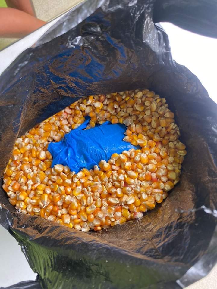 Nas buscas, com auxílio da Cão Policial “Amora”, foram encontradas com umas das passageiras, aproximadamente meio quilo de drogas e um quilo e meio de carne silvestre.