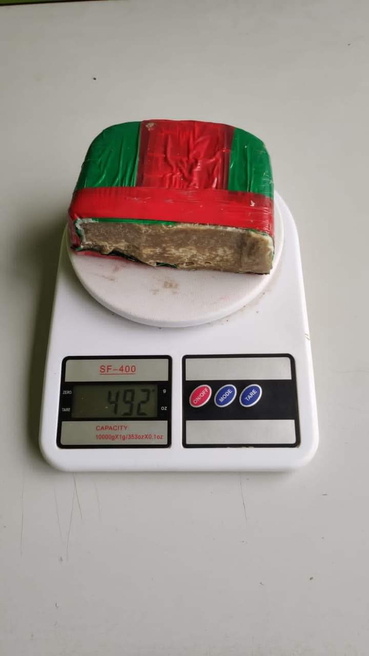 Nas buscas, com auxílio da Cão Policial “Amora”, foram encontradas com umas das passageiras, aproximadamente meio quilo de drogas e um quilo e meio de carne silvestre.