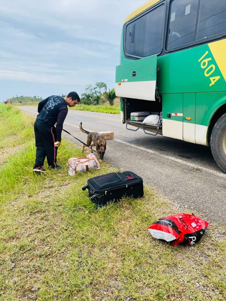 Os militares do Grupo de Operações com Cães (GOC), do 7° Batalhão, realizaram abordagem a um ônibus, que trafegava no sentido Tarauacá – Cruzeiro do Sul.