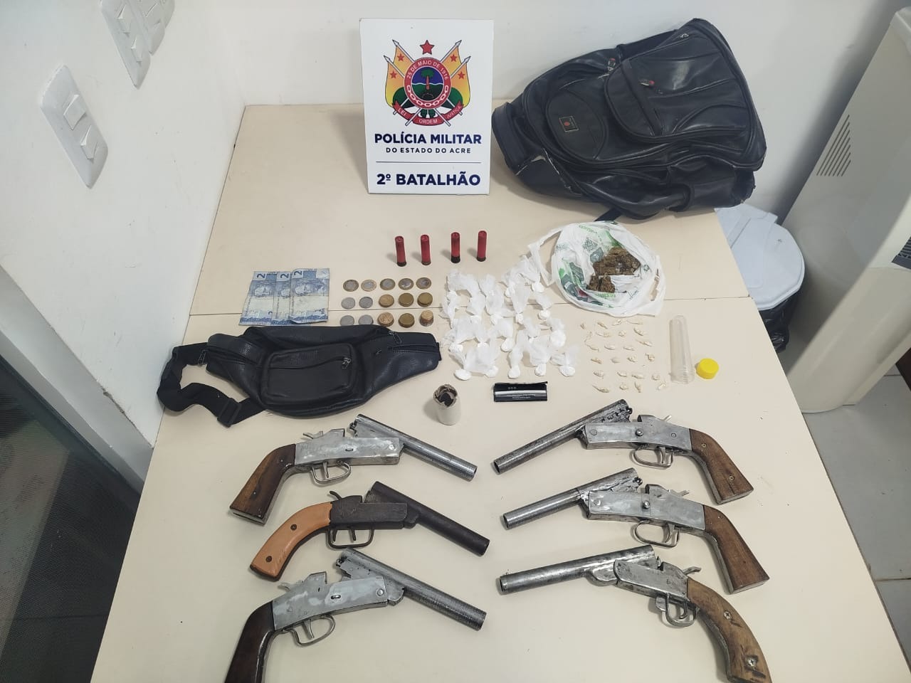 Uma ação rápida da Força Tática do 2º Batalhão da Polícia Militar resultou, na madrugada desta segunda-feira (13), na apreensão de seis armas de fogo de fabricação caseira, munições e porções de drogas, na Travessa Silvestre Coelho, no bairro Recanto dos Buritis, em Rio Branco.