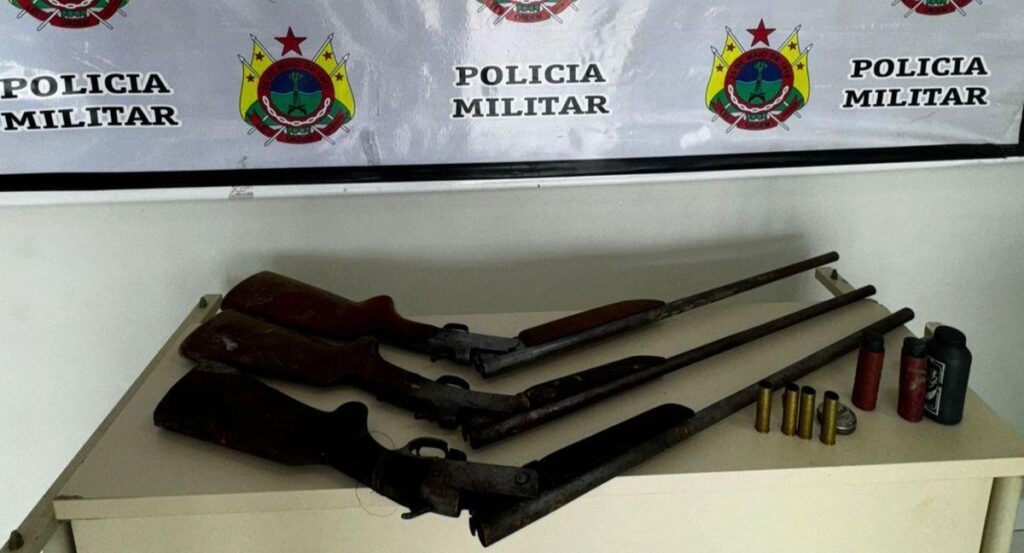 Durante as diligências realizadas nas imediações, os policiais vistoriaram uma propriedade ligada ao suposto autor, que se encontrava abandonada no momento da averiguação. No local, foram localizadas e apreendidas três espingardas, além de diversos materiais utilizados para recarga de munições.As buscas continuaram com o objetivo de localizar o suspeito, porém ele não foi encontrado até o encerramento da ocorrência.