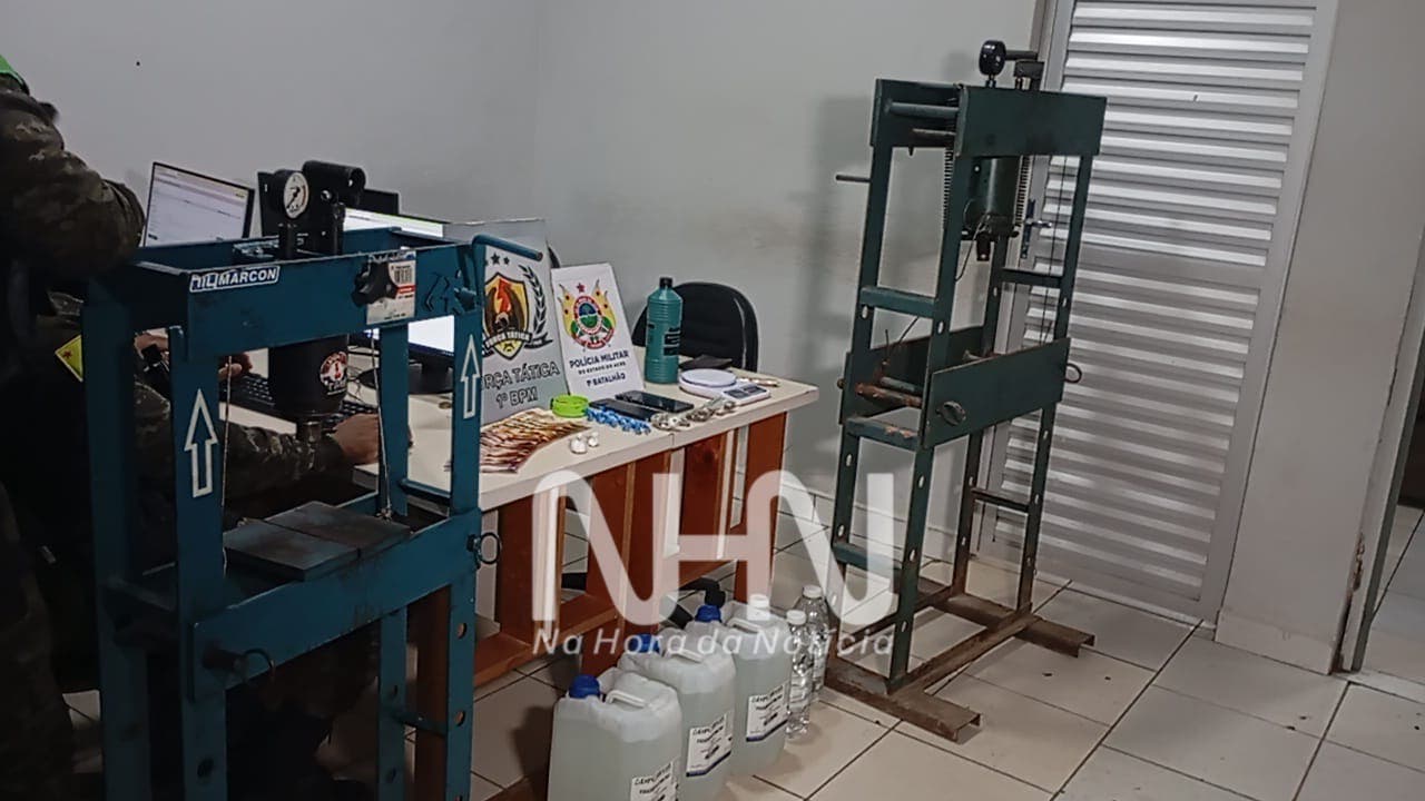 Durante a revista, foram apreendidas duas prensas, vários litros de solvente e quantidades de entorpecentes.