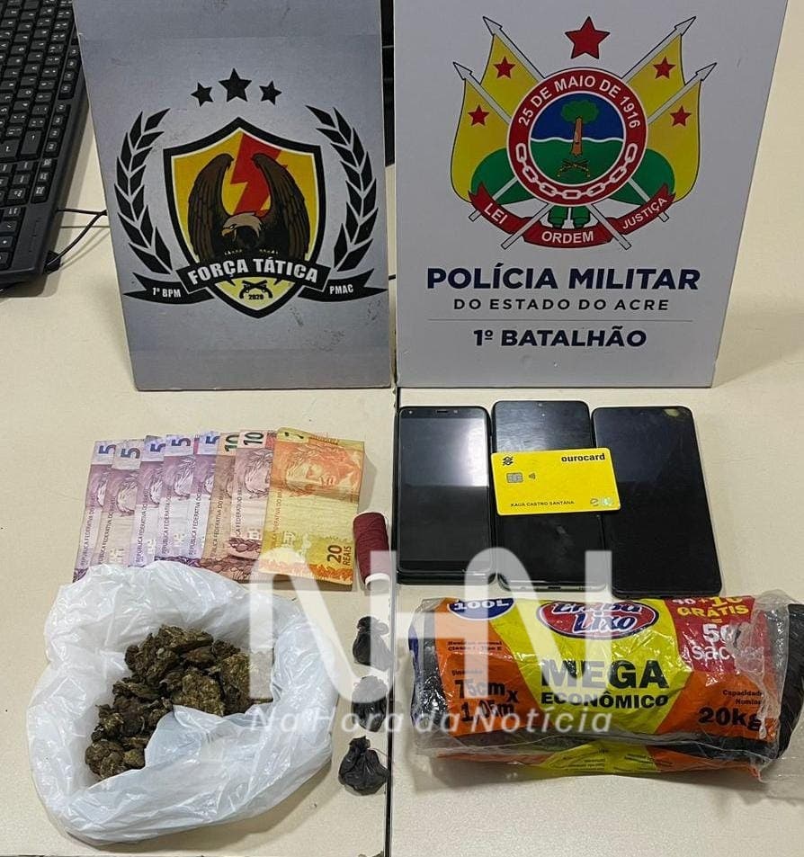 Durante a busca, foram apreendidas uma porção de maconha, pesando aproximadamente 46 gramas, três porções de cocaína, totalizando cerca de duas gramas, encontradas em uma cômoda, além de R$ 65,00 em dinheiro divididos em oito cédulas, um cartão bancário em nome do suspeito, um rolo de linha vermelha, um pacote de sacos plásticos — materiais comumente utilizados para embalar drogas — e três aparelhos celulares.