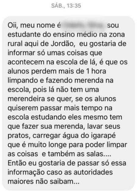 Estudantes de uma escola da zona rural do Jordão, no interior do Acre, denunciaram que eles mesmos passam mais tempo limpando a escola e fazendo merenda, do que estudando. A denúncia foi feita através do Instagram de um deputado de oposição, na Assembleia Legislativa do Acre (Aleac).