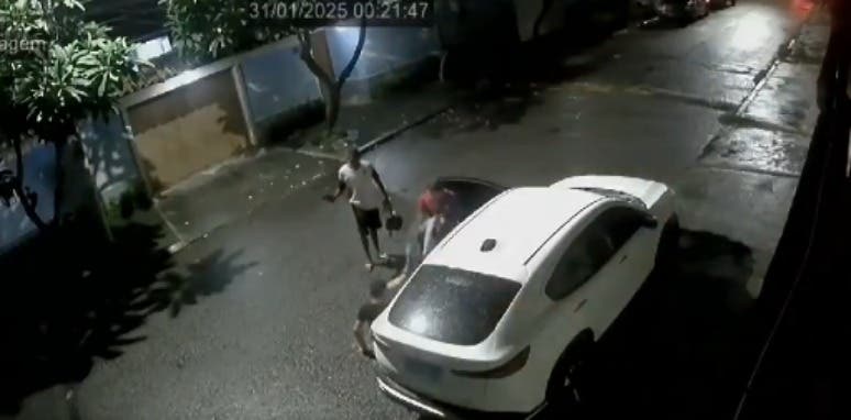 Eles começam a pegar os pertences do jogador. Quando vão tentar pegar mais alguma coisa, puxam as calças da vítima com impaciência e vão embora com o carro. O atleta foi deixado na rua apenas de cueca.