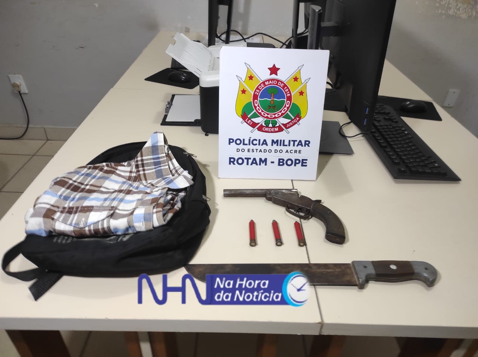 Quando os militares pararam a viatura para realizar a abordagem, um comparsa que estava com Maxsuel fugiu e entrou em uma área de mata, e os PMs não conseguiram alcançar o suspeito. Maxsuel foi abordado e revistado. Dentro da bolsa que o jovem estava carregando, havia uma garrucha de fabricação caseira calibre 36 com três cartuchos intactos, um pequeno terçado e um litro de bebida.
