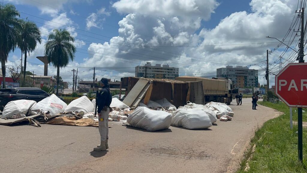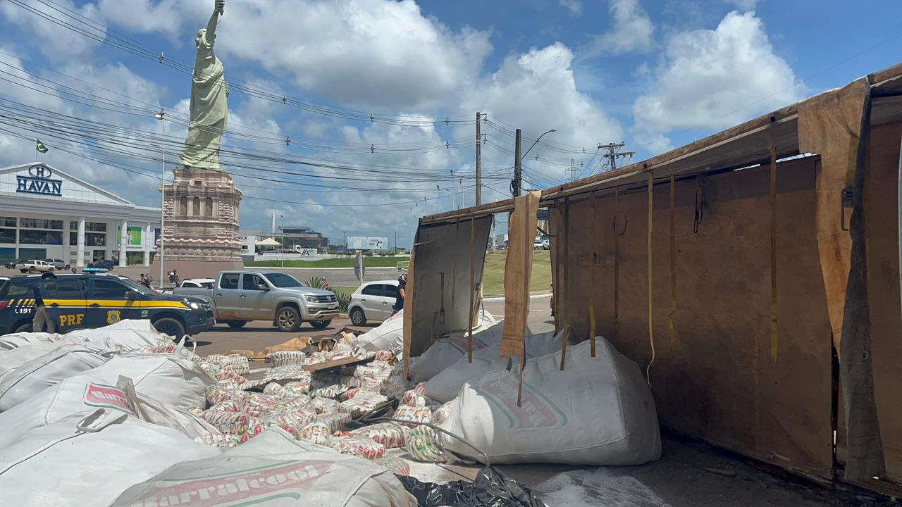 O segundo compartimento de uma carreta bitrem tombou na manhã desta terça-feira (3) na rotatória da Havan, localizada na BR-364, no bairro Portal da Amazônia, em Rio Branco.