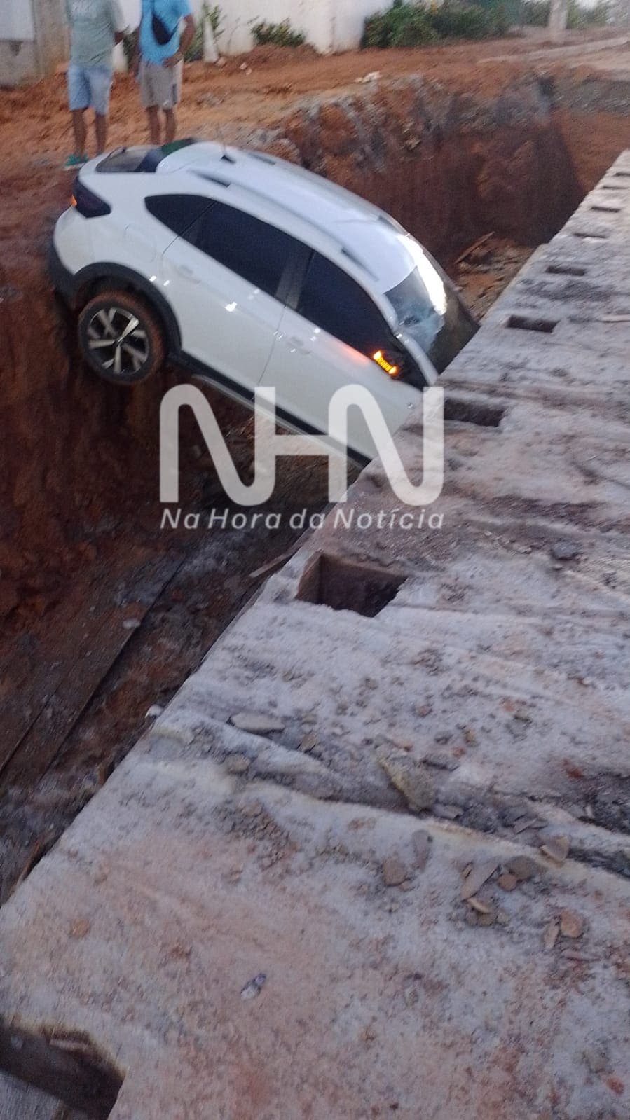 Um veículo modelo Nivus, de cor branca, invadiu o canteiro de obras do Complexo Viário da Avenida Ceará e caiu em uma vala na madrugada desta segunda-feira (19), no bairro do Bosque, em Rio Branco.